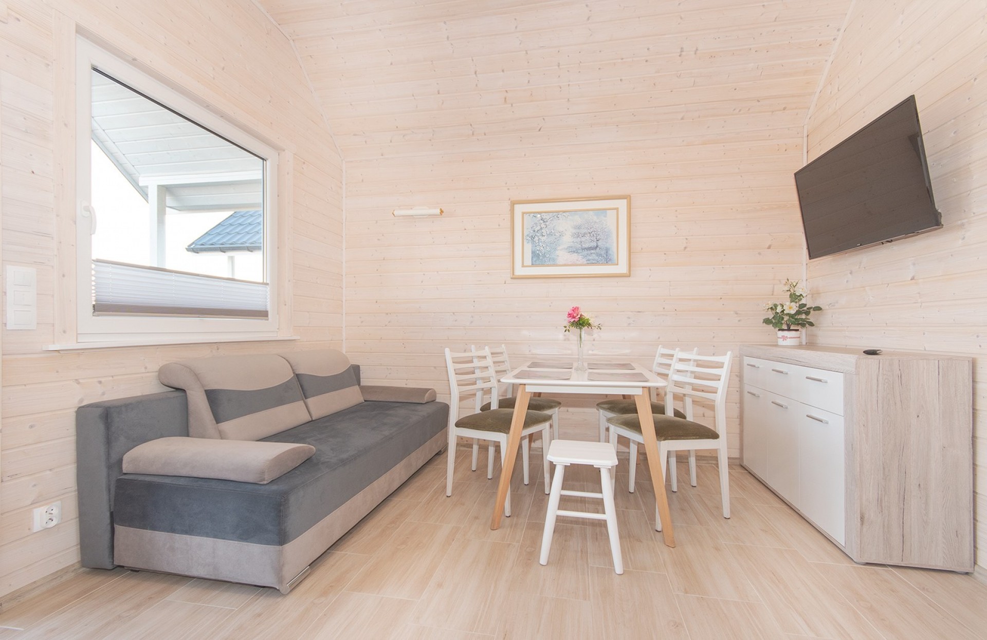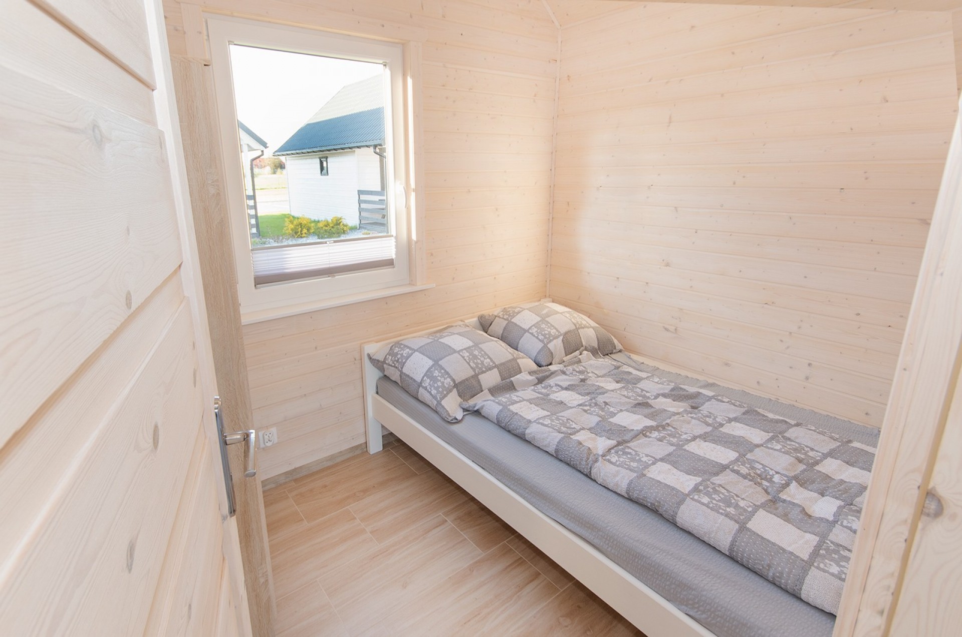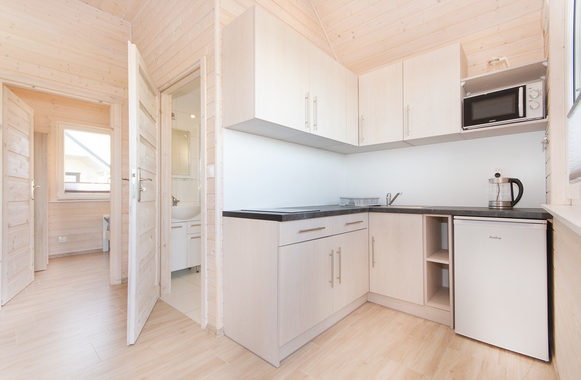 Każdy domek składa się z dwóch sypialni, salonu z rozkładaną wersalką, TV LED 43 cale, łazienki z prysznicem, aneksu kuchennego oraz tarasu (łączna powierzchnia 48 m²). Aneks kuchenny wyposażony jest w czajnik bezprzewodowy, kuchenkę elektryczną dwu palnikową, lodówkę, kuchenkę mikrofalową oraz niezbędny zestaw stołowy do codziennych posiłków. W każdym domku jest bezpłatne Wi-Fi.