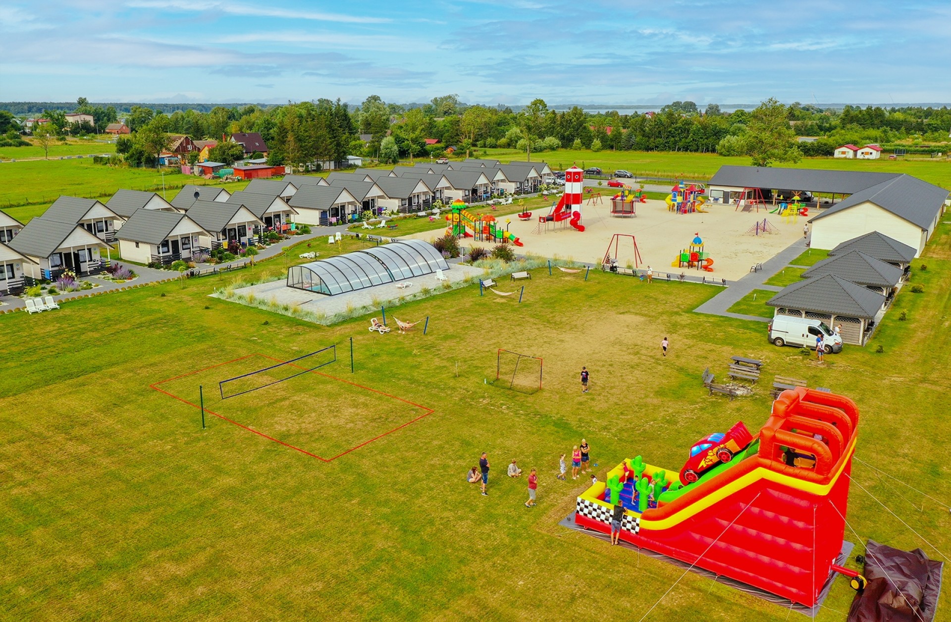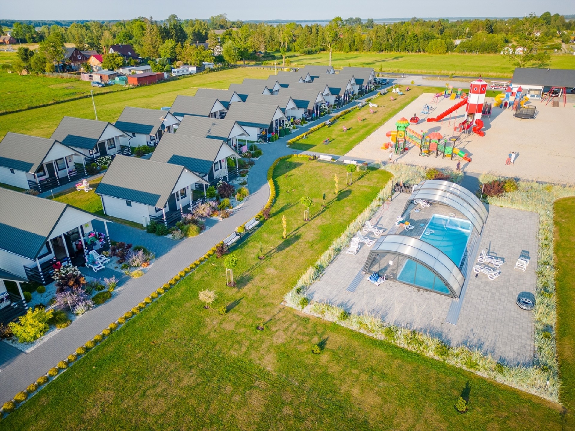 Zapraszamy na rodzinny wypoczynek do nowo wybudowanych domków Biała Perła położonych w miejscowości Jezierzany, oddalonych o 1,5 km od morza i miejscowości Jarosławiec, a także 500 metrów od Jeziora Wicko. Bogate zaplecze rekreacyjne, codzienne wakacyjne animacje i duża powierzchnia ośrodka sprawiają, że jest on idealnym miejscem na wypoczynek rodzinny. Od sezonu letniego 2024 możliwość skorzystania z wyżywienia na terenie ośrodka (obiady).