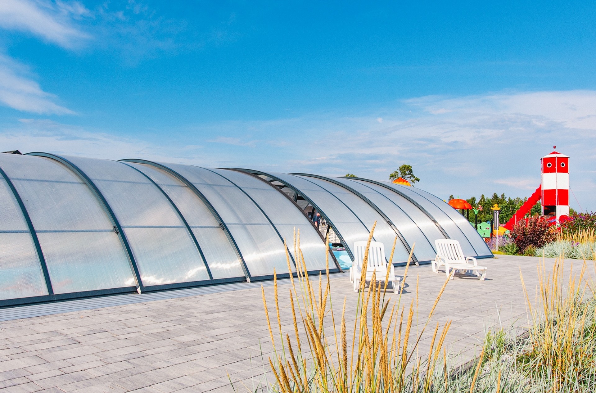 - letni basen z podgrzewaną wodą oraz strefą do opalania z leżakami,