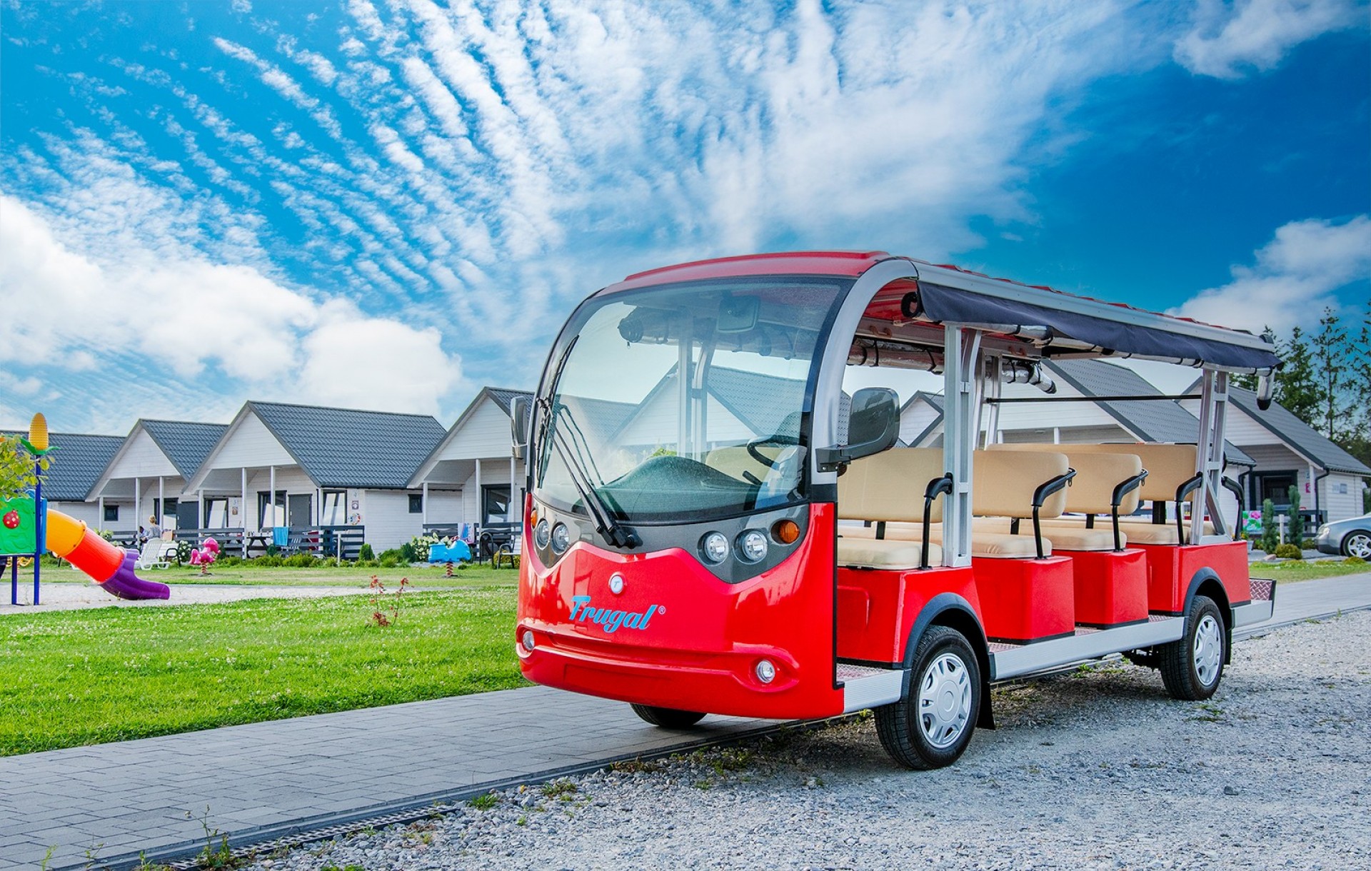 Naszych Gości dowozimy na plażę elektrycznym busem.